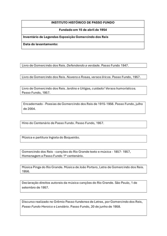 Inventário Gomercindo dos Reis, Legendas Exposição