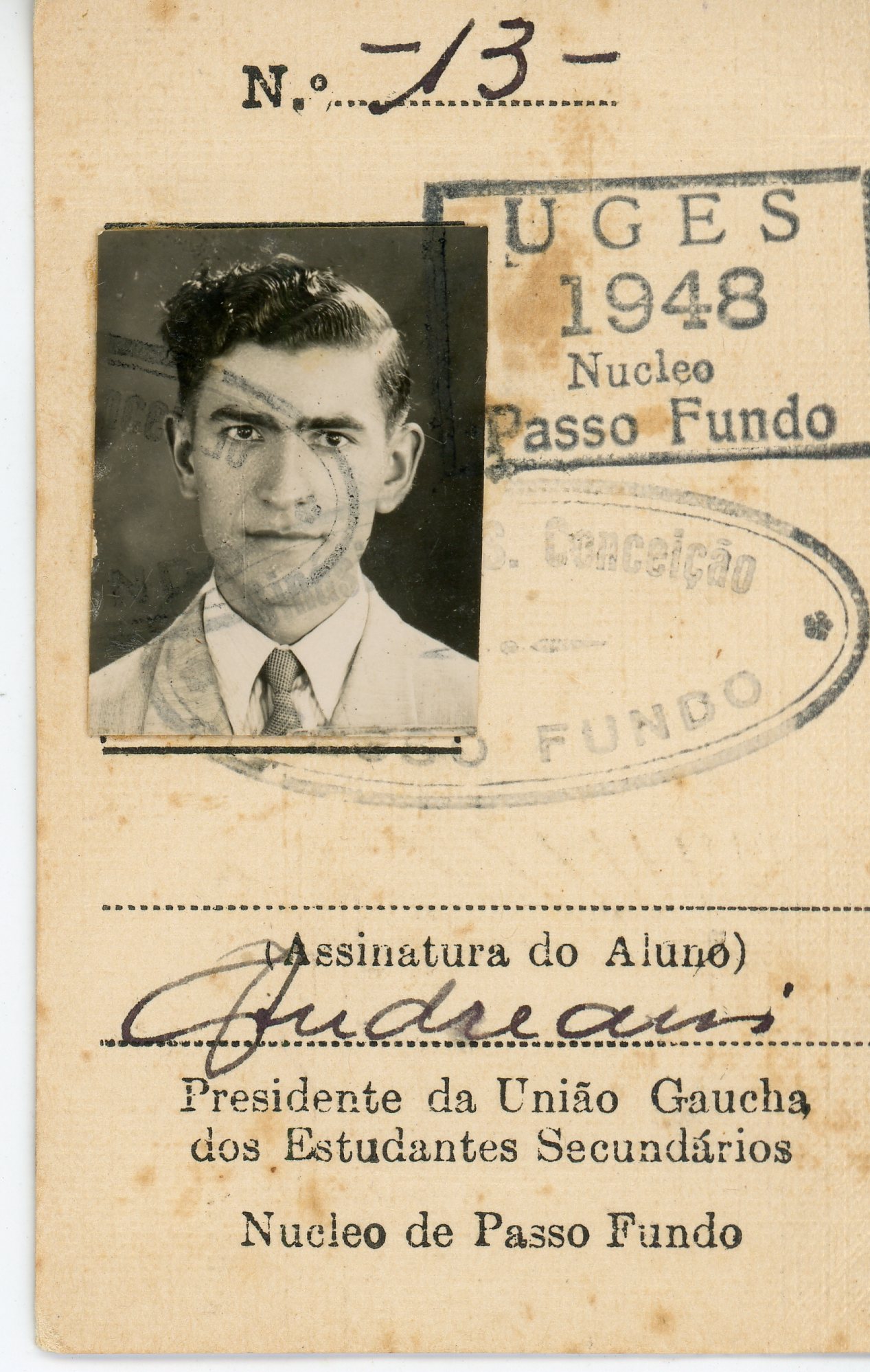 Carteirinha de Leonildo Duda, aluno do Ginásio Nossa Senhora da Conceição, da União Gaúcha dos Estudantes Secundários.