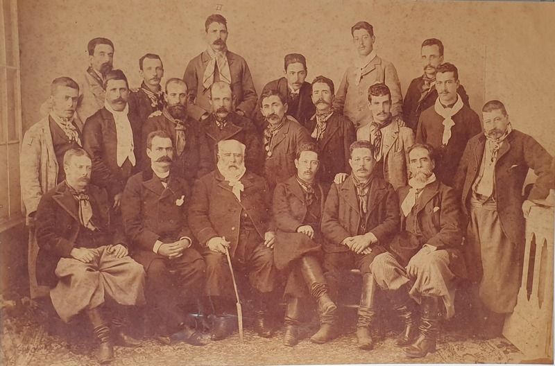Identificados, sentados: Francisco Cabeda, Estacio Azambuja, Joca Tavares, Rafael Cabeda, Joanico Tavares, Procópio Gomes de Mello. Ao centro: Ismael Ribeiro, Vignolis, Cel. Antonio Barboza Netto, Pedro da Silva Tavares, Maneco Jorge, Tenente Pires, Francisco Joaquim Amaro da Silveira, Zeferino Costa e Anibal Pachão. Ao fundo: João Gomes de Mello, Ezidoro Dias Lopes, Capitão Salgado, Emílio Nunes, Antonio Ferreira Ramos e Vasco Amaro da Silveira.