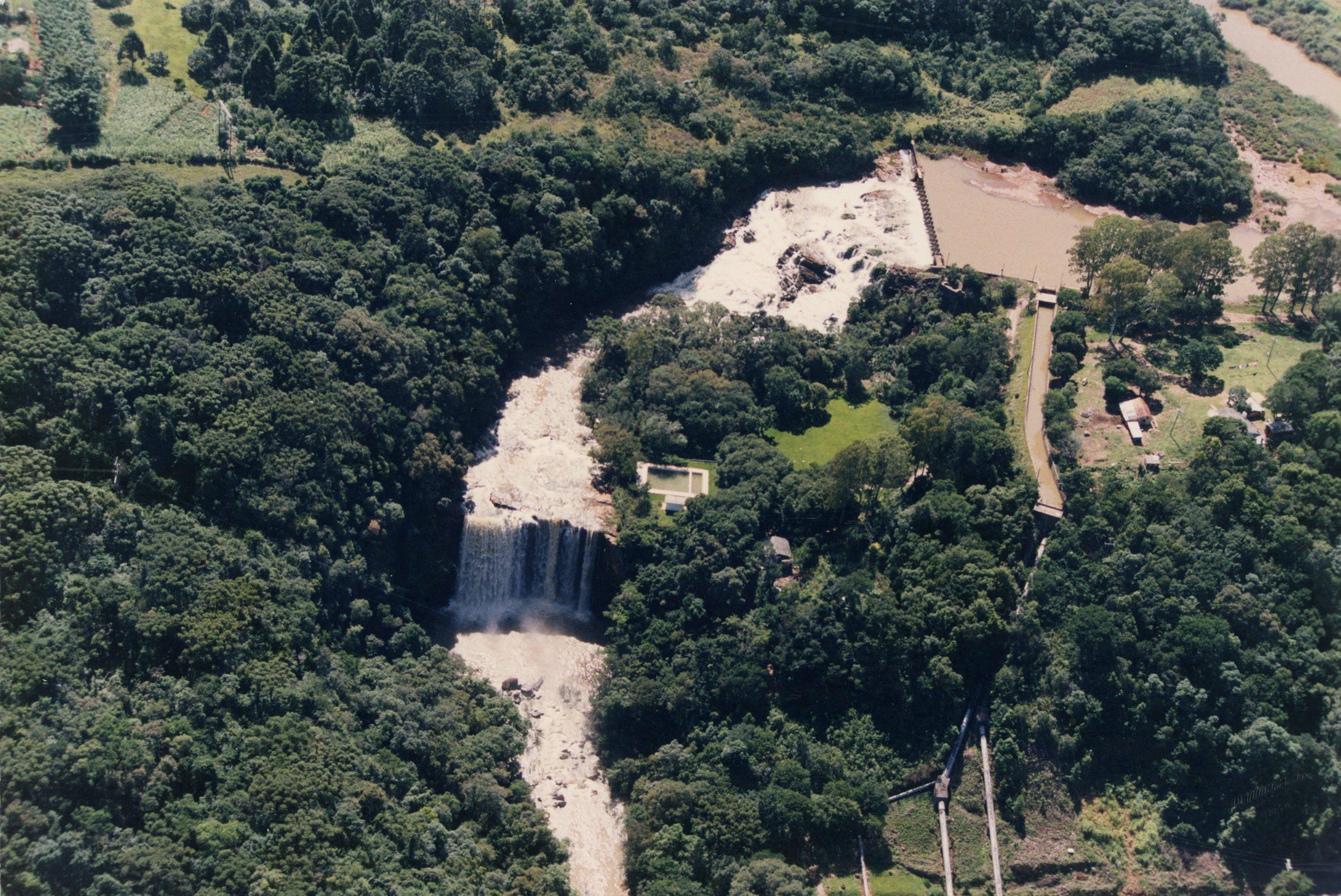 Vista aérea da Cascata do Taquari e da usina de energia elétrica.