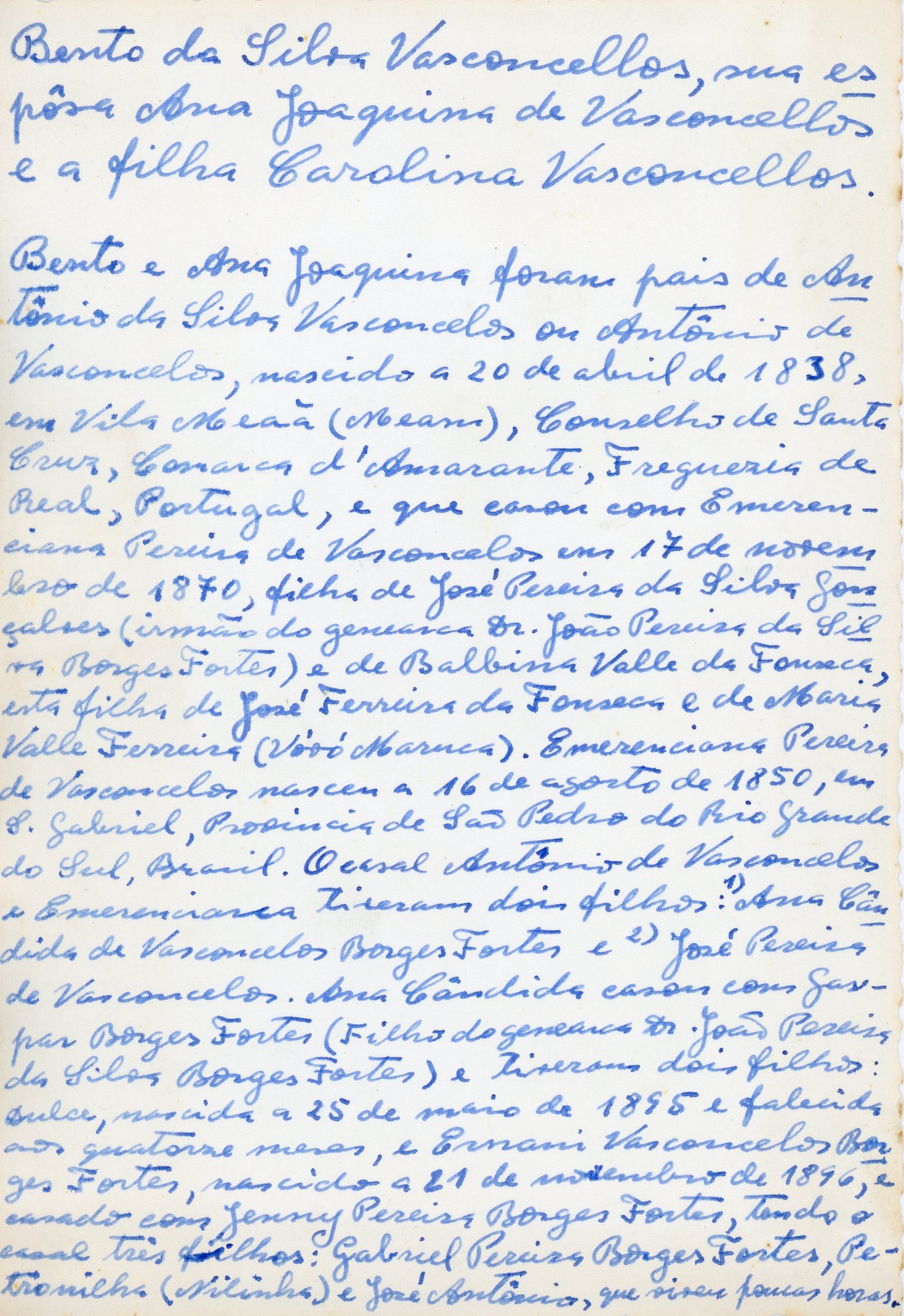 O casal Bento e Anna Joaquina, trisavós de Gabriel Pereira Borges Fortes, tiveram os filhos: Luís, nascido em 1833; Rodrigo, nascido em 1834; Antonio, nascido em 1838 (bisavô de Borges Fortes); Joaquim, nascido em 1840; José, nascido em 1848; Estevão, nascido em 1851; Carolina, nascida por volta de 1853; e Maria José.