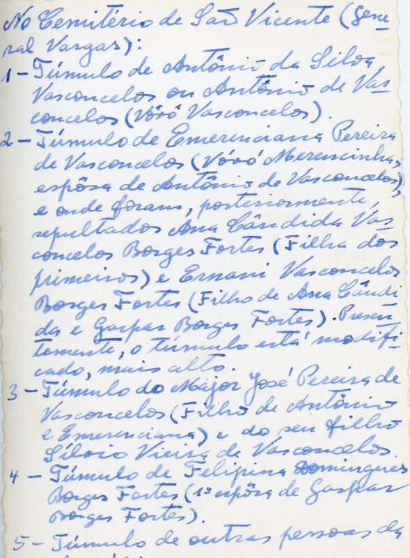 2- Túmulo de Emerenciana Pereira de Vasconcelos (Vóvó Merencinha, espôsa de Antônio de Vasconcelos), e onde foram, posteriormente, sepultados Ana Cândida Vasconcelos e Borges Fortes (Filha dos primeiros) e Ernani Vasconcelos Borges Fortes (Filho de Ana Cândida e Gaspar Borges Fortes). Presentemente, o túmulo está modificado, mais alto.