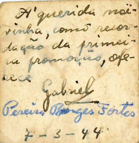 "À minha querida noivinha, como recordação da primeira promoção, oferece Gabriel. 7-3-1944"