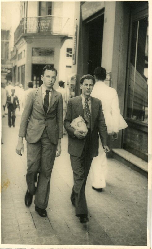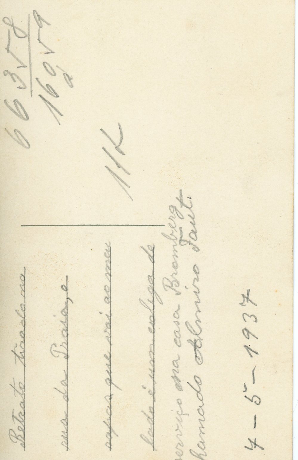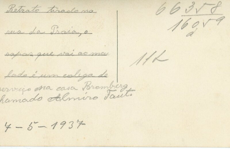 No verso consta a inscrição "Retrato tirado na rua da Praia, o rapaz que vai ao meu lado é um colega de serviço na casa Bromberg chamado Almiro Faut.