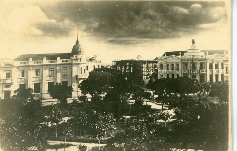 Vista da cidade, árvores e edifícios. Local não identificado.
