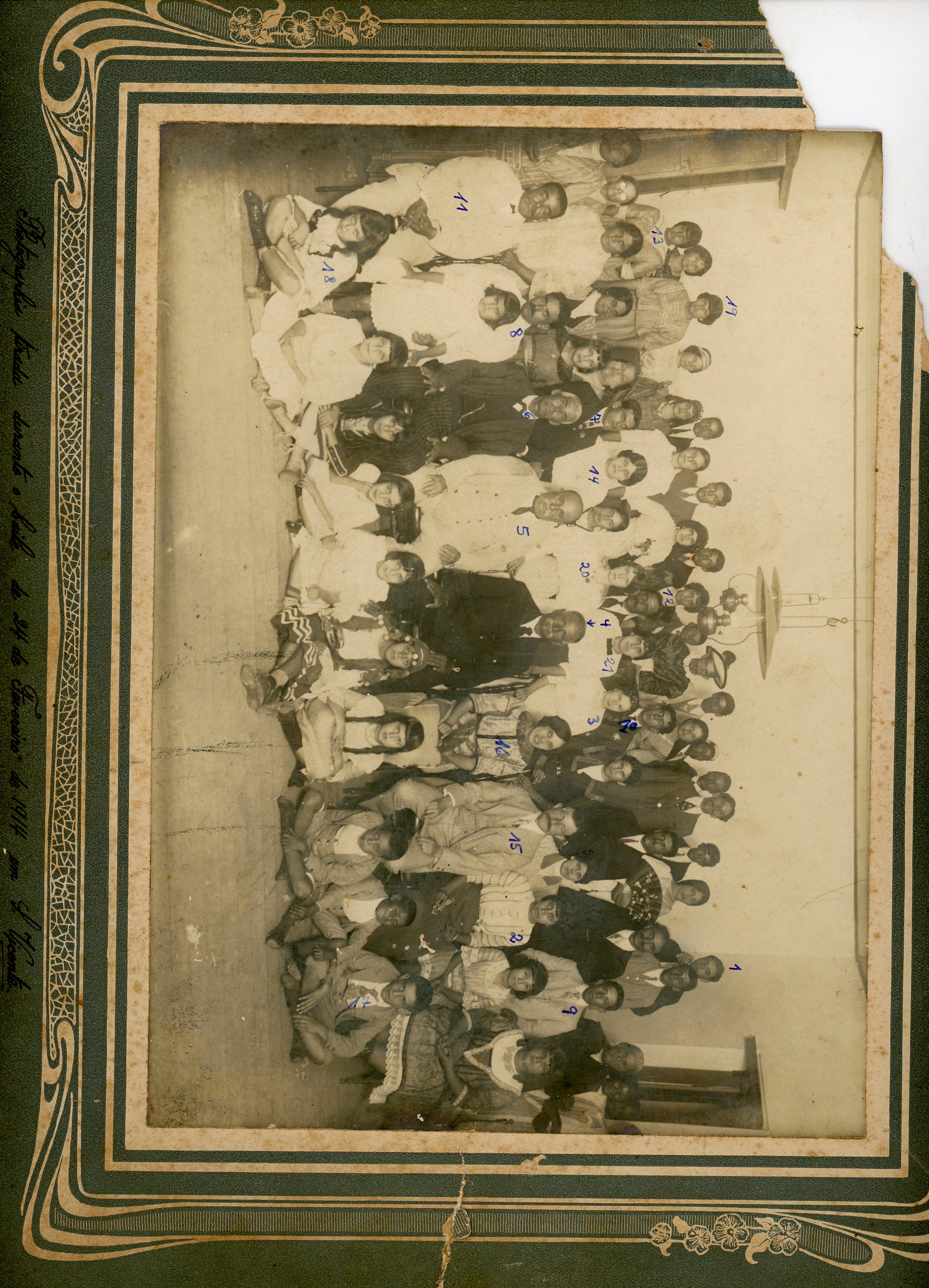 No verso consta a inscrição, 1)- Ernani Vasconcelos Borges Fortes - 2)- Aldina do Amaral Coelho em solteira; Aldina Coelho da Silva, no 1° matrimônio, com Cristóvão Teixeira da Silva, Aldina Coelho Gomes, no 2° matrimônio, com Pedro Gomes Moreira. 3)- Marieta Mitzcherlick de Vasconcelos, filha de criação de Antônio de Vasconcelos. 4)- Cel. José João de Lima Pereira, irmão de Emerenciana Pereira de Vasconcelos (vovó Merencinha). 5) - Vasco Carvalho, avô de Herófilo Azambuja. 6)- "seu Tico", fanhoso. 7)- Antônio Fagundes Teixeira, que foi coronel da Brigada militar e sogro do Prof. Afonso Azambuja de Macedo Brum. 8)- João da Mata Teixeira, pai de Antônio Fagundes Teixeira. 9)- João Dantas ou João Pilar Dantas, que foi farmacêutico. 10)- Astrogildo Vidal (Gildo). 11)- O telegrafista (Sr. Cunha?). 12)- Ester Vidal. 13)- Tídia Castro, filha de João Castro, irmã de Plácido de Castro. 14)- Glória Amaral de Castro, filha de João de Castro. 15)- Dr. Tedesco, médico. 16)- Anália Pilar, cunhada do Dr. Armando Vitorino Prates, irmã de Dona Josefina. 17)- Júlio Fagundes Teixeira. 18)- Eloísa Fagundes Teixeira, que casou com o Dr. José Athanásio, médico em São Jerônimo. 19)- "Big" do Amaral Castro, filha de João de Castro. 20)- Ilza, filha do Cel. José João de Lima Pereira. 21)- Quica, filha de seu Tico.