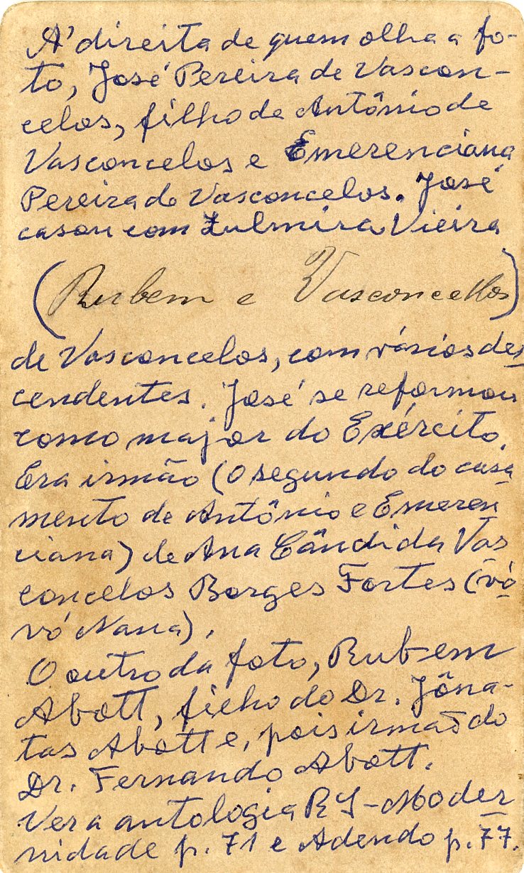 No verso consta a inscrição, "A' direita de quem olha a foto, José Pereira de Vasconcelos, filho de Antônio de Vasconcelos e Emerenciana Pereira de Vasconcelos. José casou com Zulmira Vieira