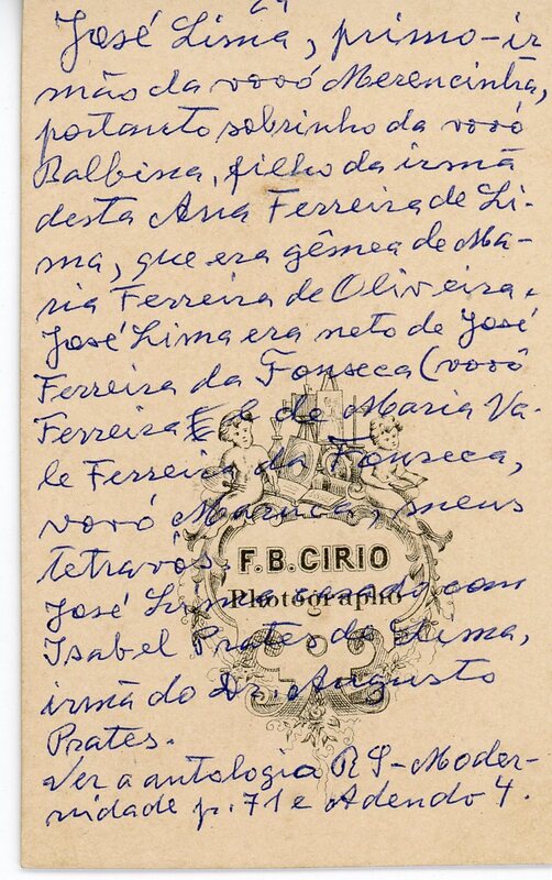 No verso consta a inscrição, " José Lima, primo - irmão da vovó Merencinha, portanto sobrinho da vovó Balbina, filho da irmã desta Ana Ferreira de Lima, que era gêmea de Maria Ferreira de Oliveira e José Lima era neto de José Ferreira da Fonseca ( vovô Ferreira) e de Maria Vale Ferreira da Fonseca, vovó Maruca, meus tetravós.