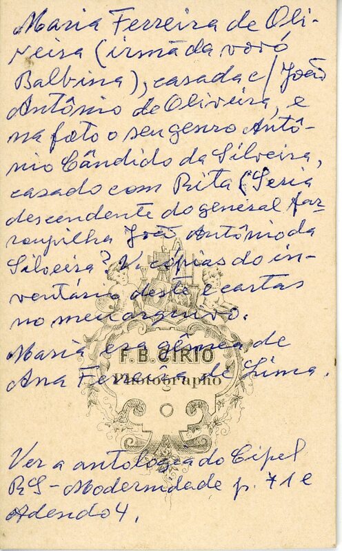 No verso consta a inscrição, " Maria Ferreira de Oliveira (irmã da vovó Balbina), casada c/ João Antônio de Oliveira, e na foto o seu genro Antônio Cândido da Silveira, casada com Rita (Seria descendente do general farroupilha João Antônio da Silveira ? V. cópias do inventário deste e cartas no meu arquivo.