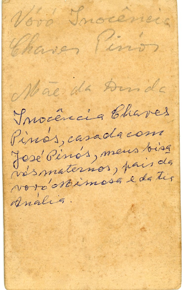 No verso consta a inscrição, "ovó Inocência Chaves Pinós