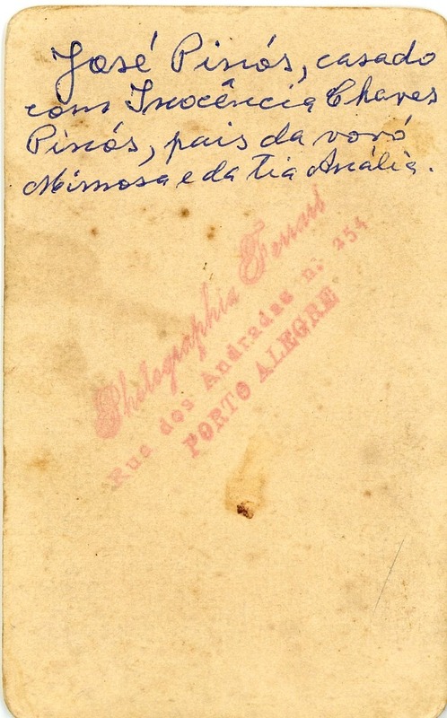 No verso consta a inscrição, "José Pinos, casado com Inocência Chaves Pinós, pais da vovó Mimosa e da Tia Anália."