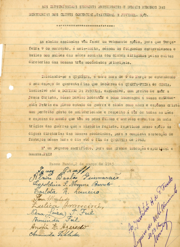 Abaixo assinado para moderação na terça-feira do carnaval dirigido as Prfesidencias dos Clubes Caixeiral, Comercila e Juvenil