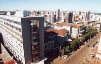 Vista aérea do Hospital de Clínicas Vista aérea do centro de Passo Fundo, vendo-se em primeiro plano o Hospital de Clínicas; ao fundo, vê-se, a Paróquia Sagrado Coração de Jesus. -