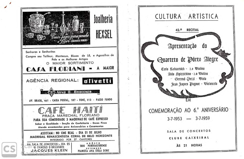 Quarteto de Porto Alegre - 1º violino : Cario Kohacevich; 2º violino: Aldo Spizzichino; viola : Gertrud Petzl; celo : Jean Jacques Pagnot