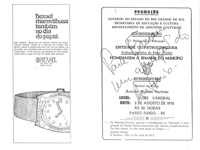 Acervo protegido pela Lei 9.610/98. Proibida a reprodução para fins comerciais sem a autorização dos detentores legais do direito. A reutilização deste conteúdo é livre e gratuita devendo ser mencionado o IHPF como fonte de referência, na seguinte forma: Acervo Instituto Histórico de Passo Fundo. Se o item pertencer a alguma coleção/fundo, o nome também deve ser citado.
