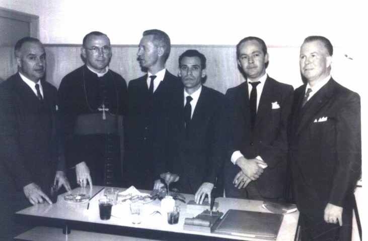 Funcionários do banco. A foto na inauguração vendo-se Frederico Célia, do Conselho Fiscal, Bipo Cláudio Colling, Amo Largen, Presidente, Walfrídio Fonseca, primeiro gerente, Prefeito Benoni Rosado.