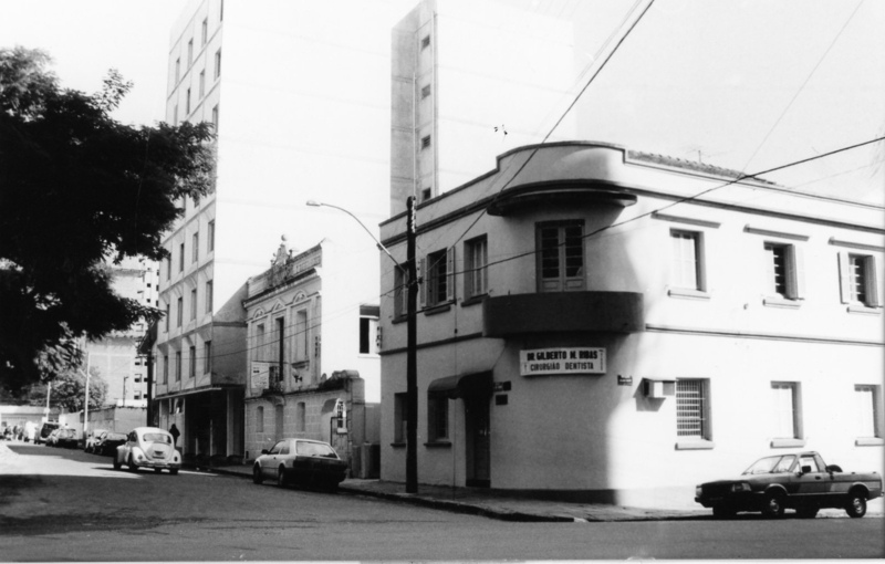 Vista da Rua Paul Harris, esquina com Benjamin Constant. Em primeiro plano o consultório do dentista Gilberto Ribas e ao fundo a Casa Della Méa.