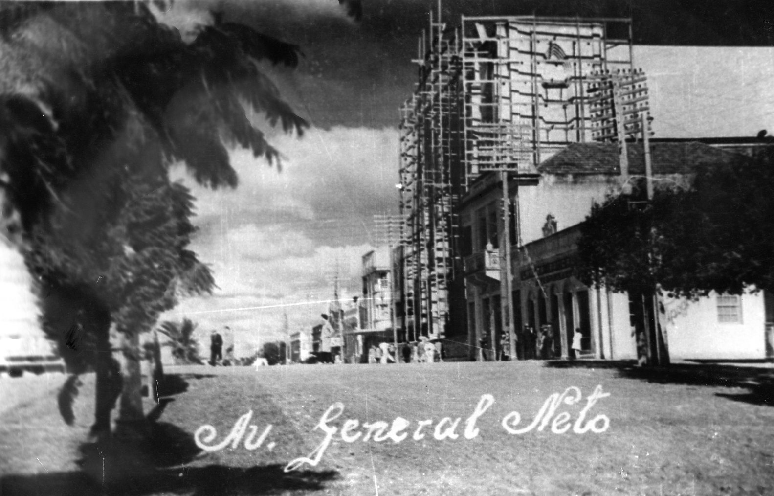 Vista da Rua General Netto, na esquina da Rua Moron, vendo-se ao fundo a Catedral em construção, o Palacete Pretto (Café Elite) e a Livraria Progresso.