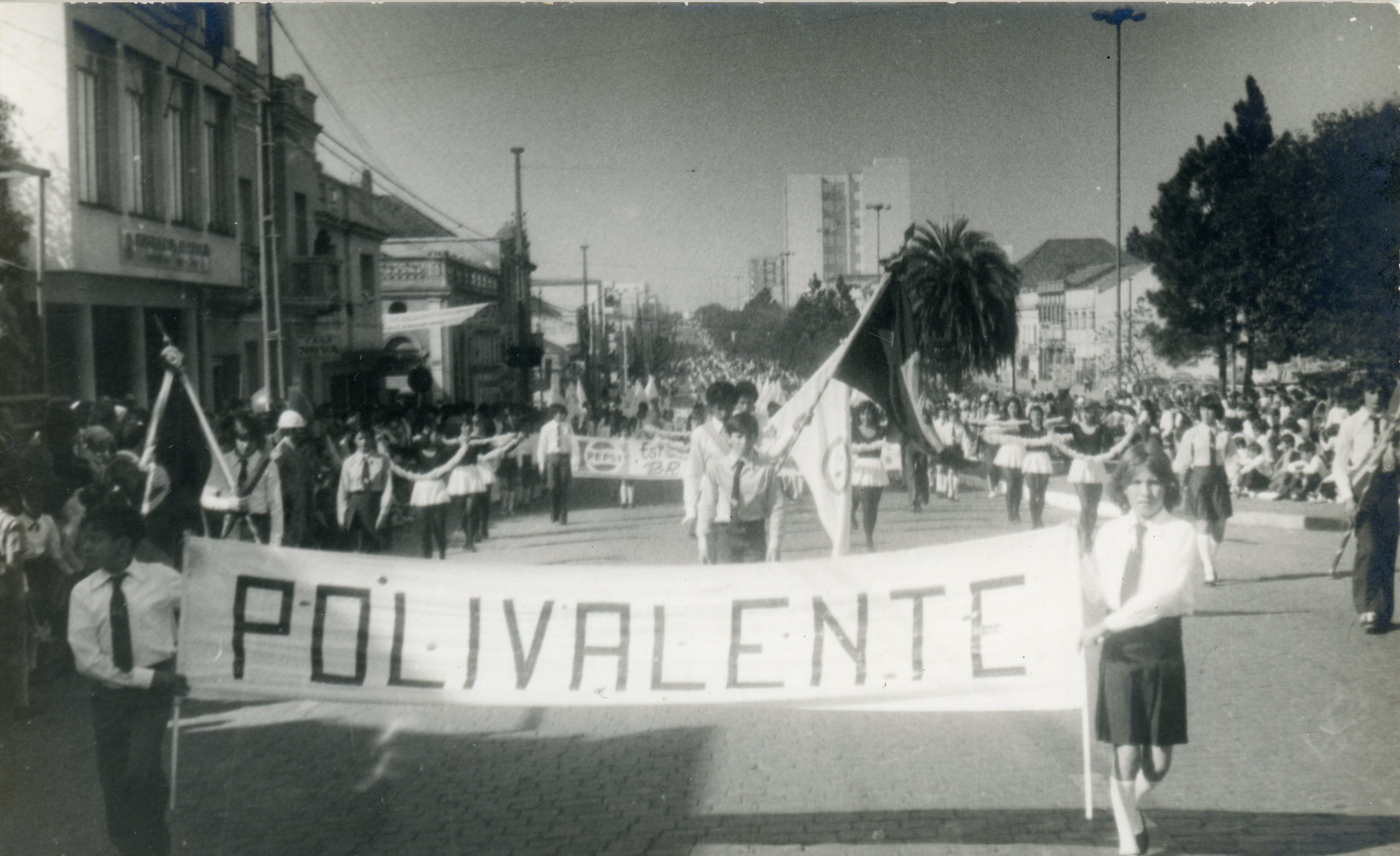 Desfile na Avenida Brasil, entre as quadras da Rua Quinze de Novembro e Rua Teixeira Soares. O destaque são os alunos da Escola Polivalente, atual Escola Ernesto Tochetto.