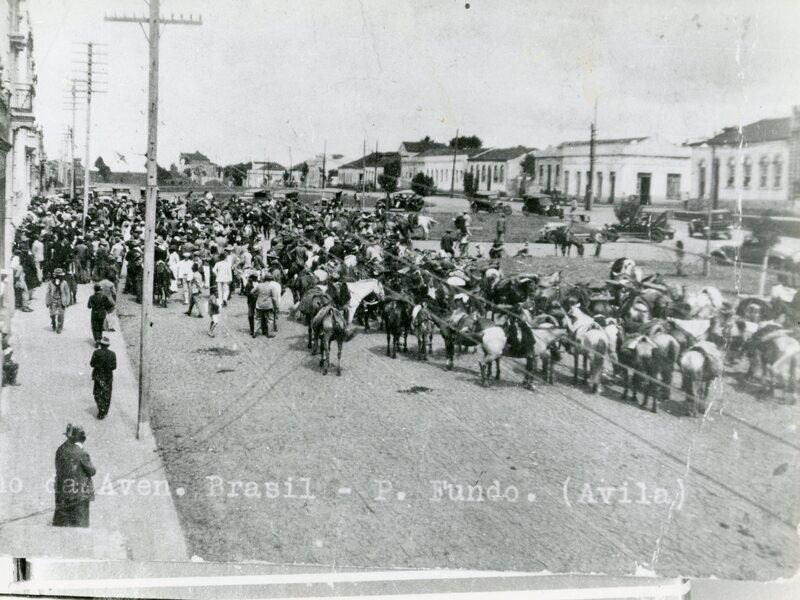 Uma vista da Avenida Brasil com uma reunião de moradores, com seus cavalos encilhados, em frente a Intendência Municipal