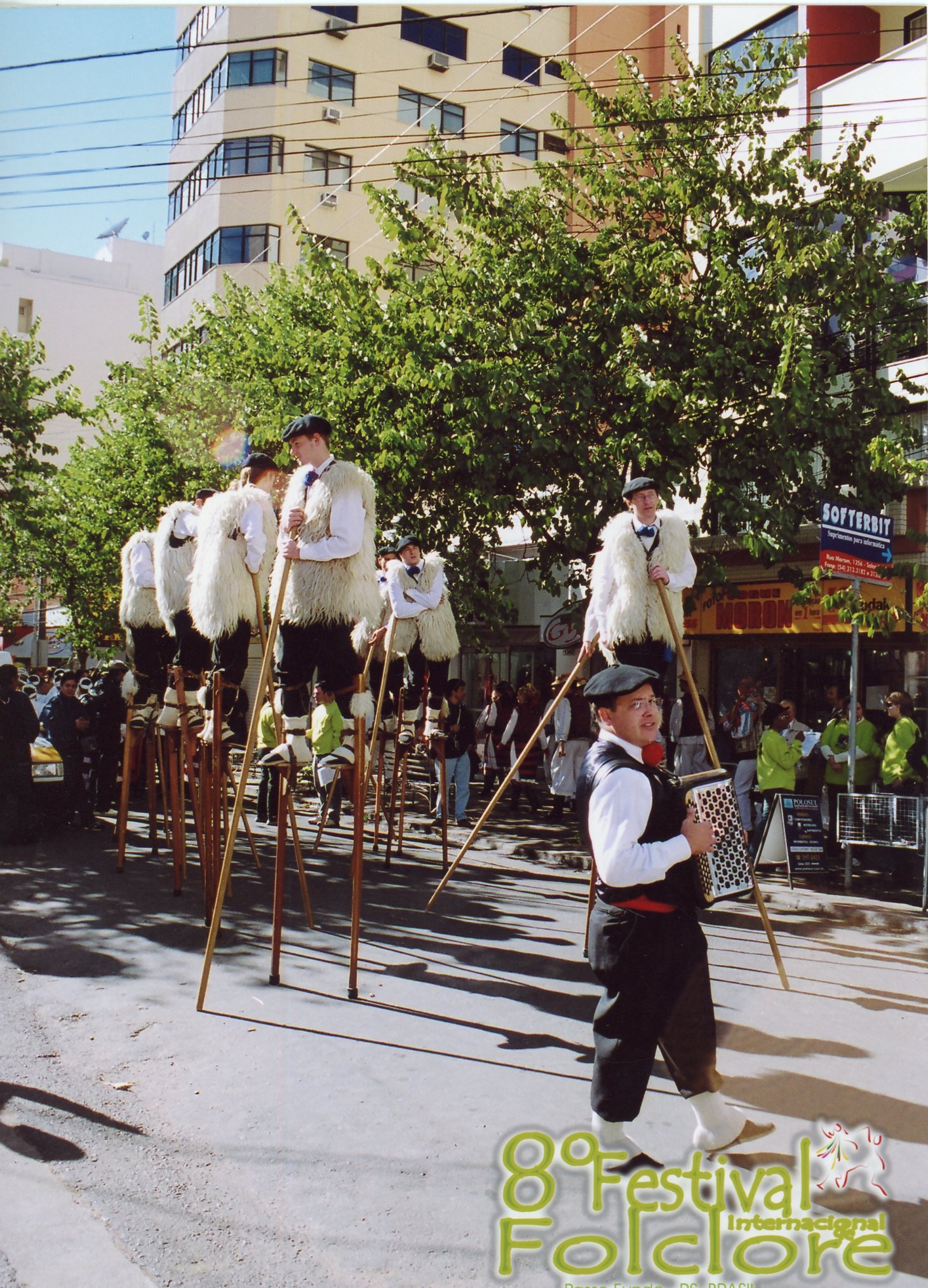 Apresentação realizada com pernas de pau passando pela Rua Moron