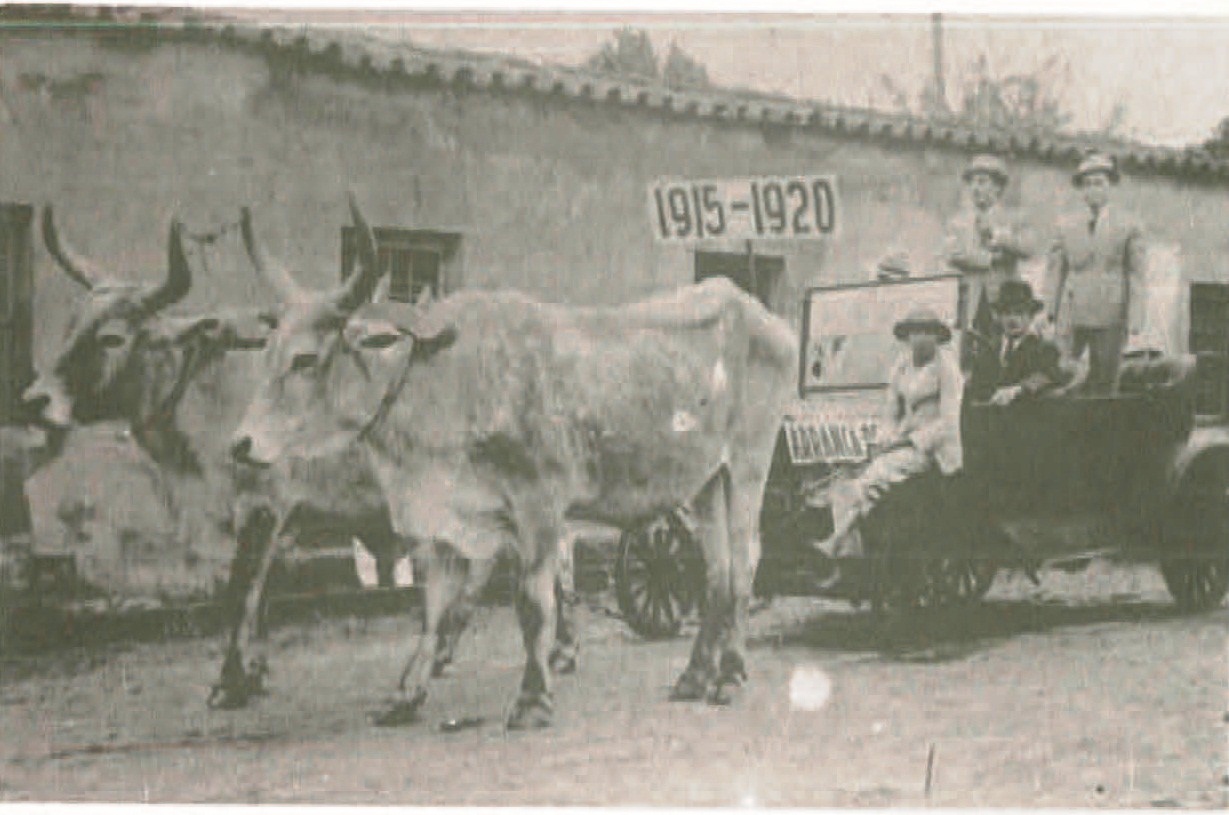 1941 - Dia do viajante, em 1915 - 1920, devido as péssimas estradas, o Caixeiro Viajante necessitava de ajuda do carreteiro com sua junta de bois. O prédio é na esquina da Marcelino Ramos com a Paissandú onde hoje é a EENAV. Nota: o veículo tinha pneus de borracha maciça e motor. Na foto está puxado por animais porque já não funcionava e nem tinha mais pneus. Estava há muito abandonado em um galpão, e foi emprestado para desfile dos viajantes.