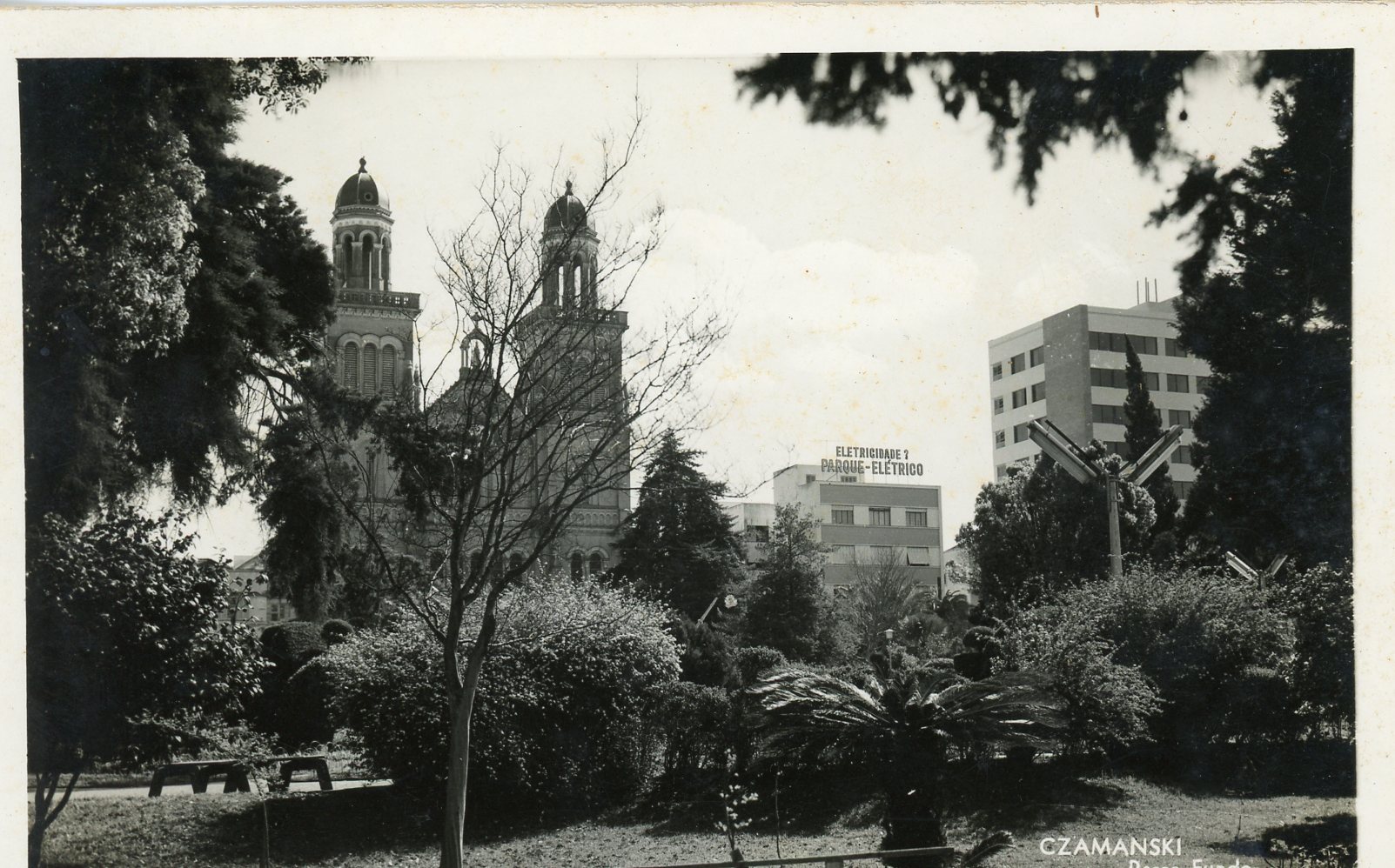 Vista da Praça Marechal Floriano, vendo-se, ao fundo, a Catedral de Passo Fundo, Edifício Serrador e a loja Parque Elétrico.