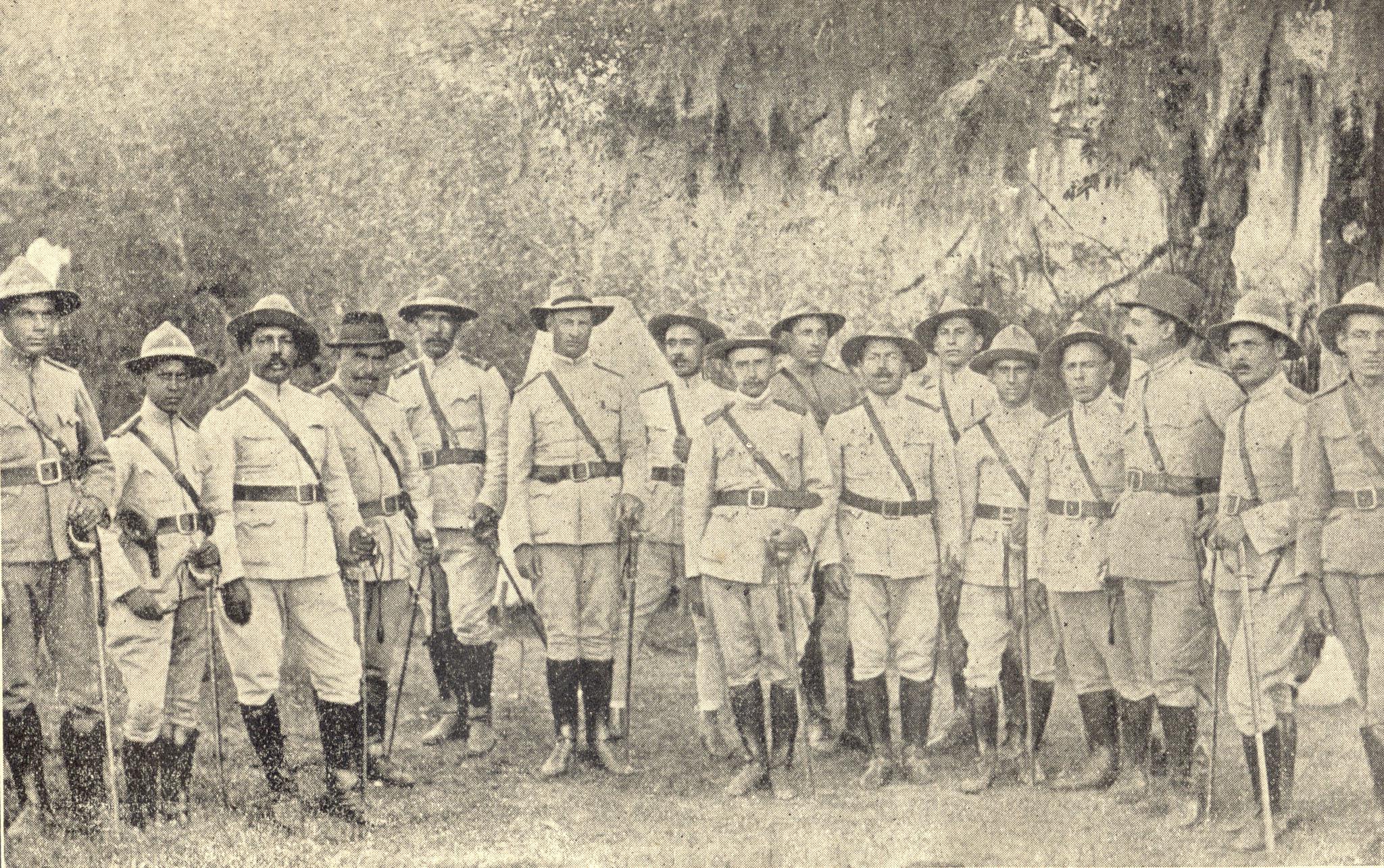Oficialidade do 1º Regimento da Cavalaria da Brigada Militar, durante a Revolução de 1923, no acampamento da Brigada, próximo às margens do rio Passo Fundo. Na 6ª posição, da esquerda para a direita, vê-se o Tenente-coronel Claudino Nunes Pereira, comandante do regimento.