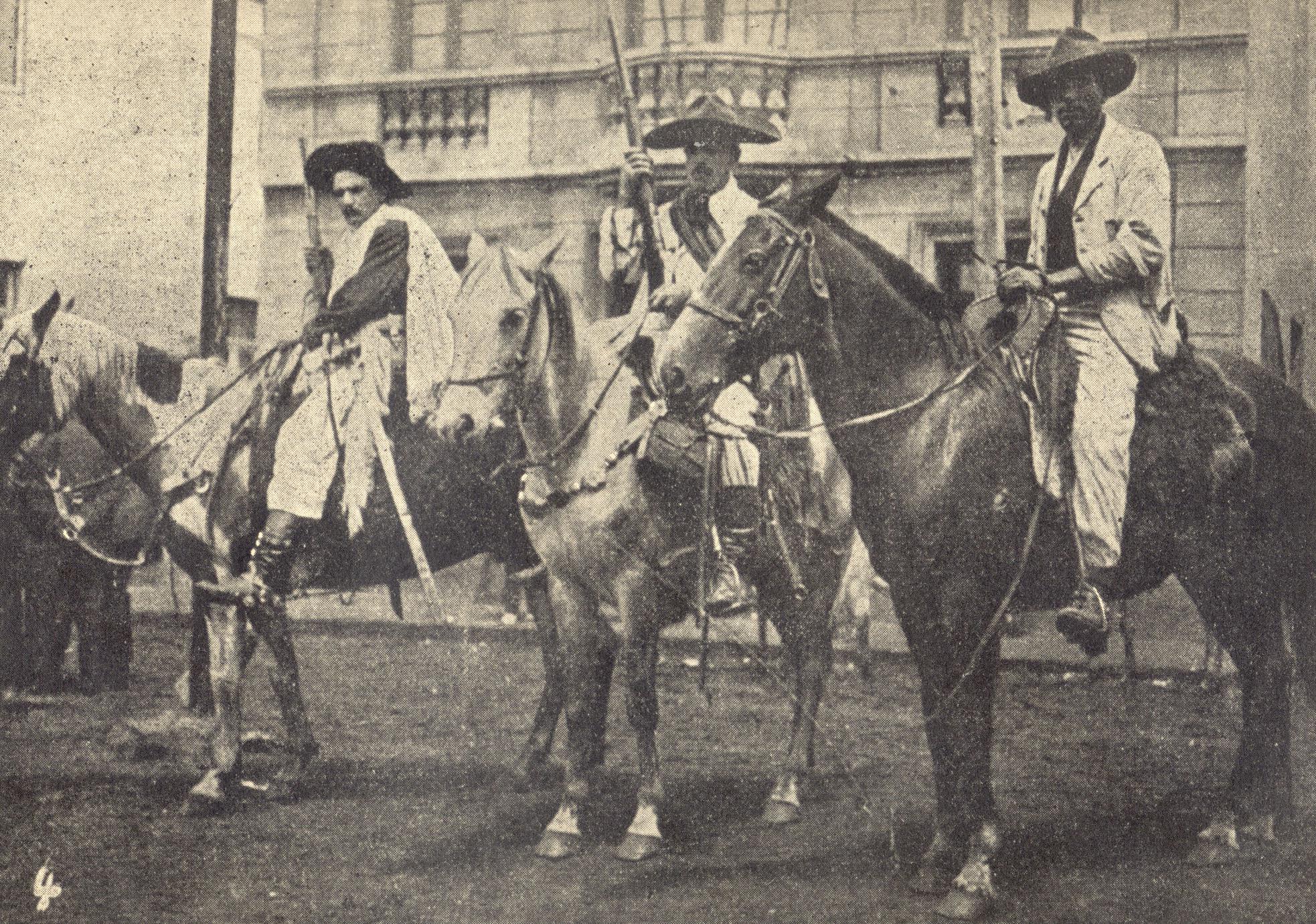 Três governistas civis armados e montados a cavalo defronte ao Fórum da Comarca de Passo Fundo (atual Teatro Múcio de Castro), à Avenida Brasil, durante o cerco à cidade de Passo Fundo, na Revolução de 1923; o primeiro, da direita para a esquerda, é o estancieiro Lauro Xavier de Castro.