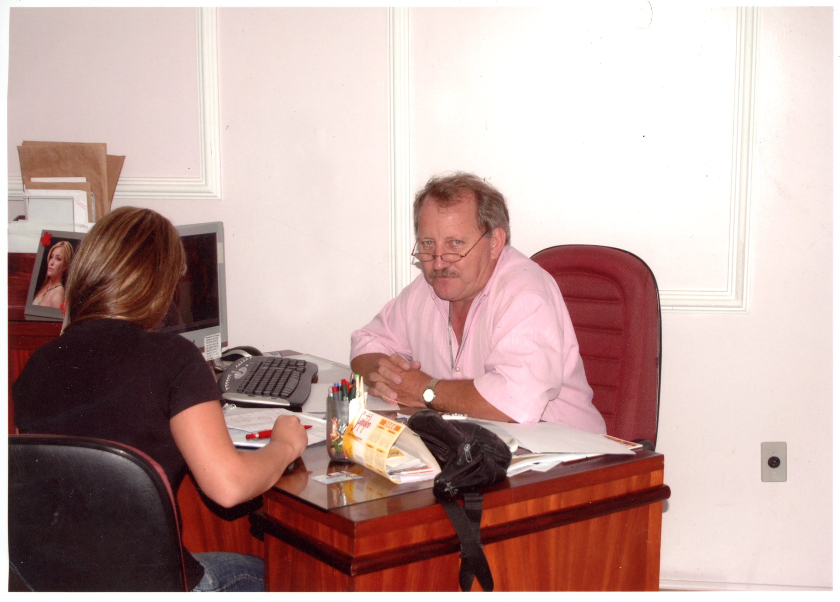 Fotógrafo César Benck em seu escritório atendendo cliente.