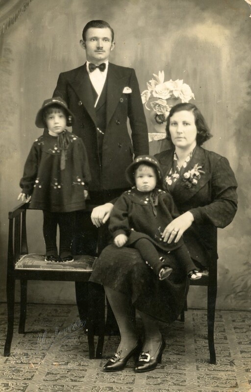 Retrato da família de Antônio Dalila e Alda Shirley, vendo-se o casal e duas crianças.