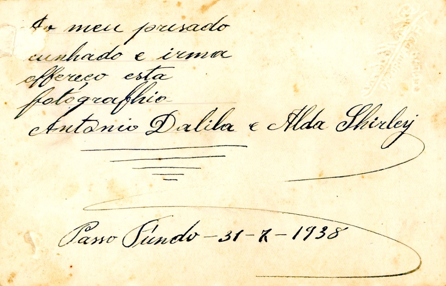 "Ao meu presado cunhado e irma offereço esta fotographia. Antonio Dalila e Alda Shirley. Passo Fundo - 31-2-1938."