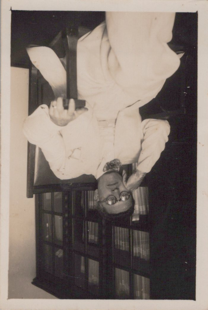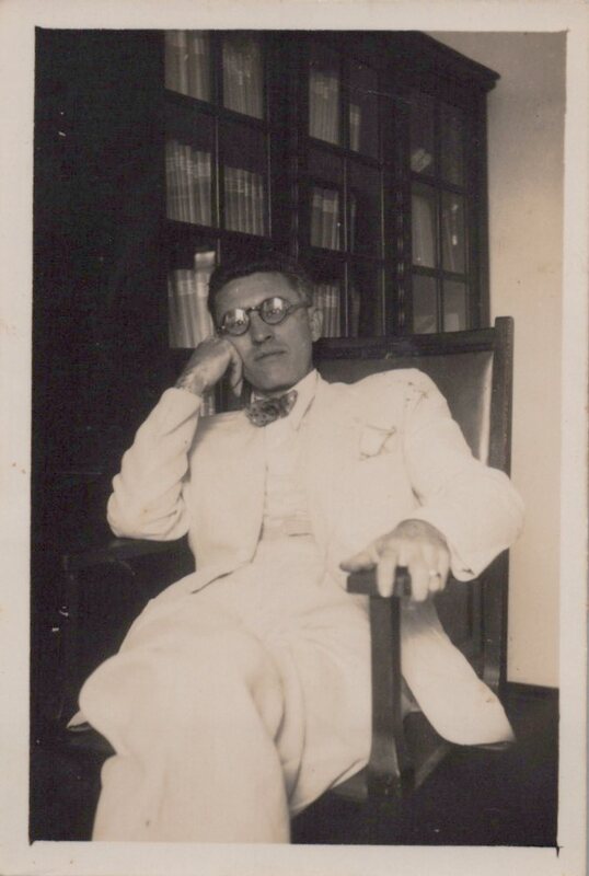 Retrato de figura masculina não identificada; em frente a estantes livreiro envidraçadas.