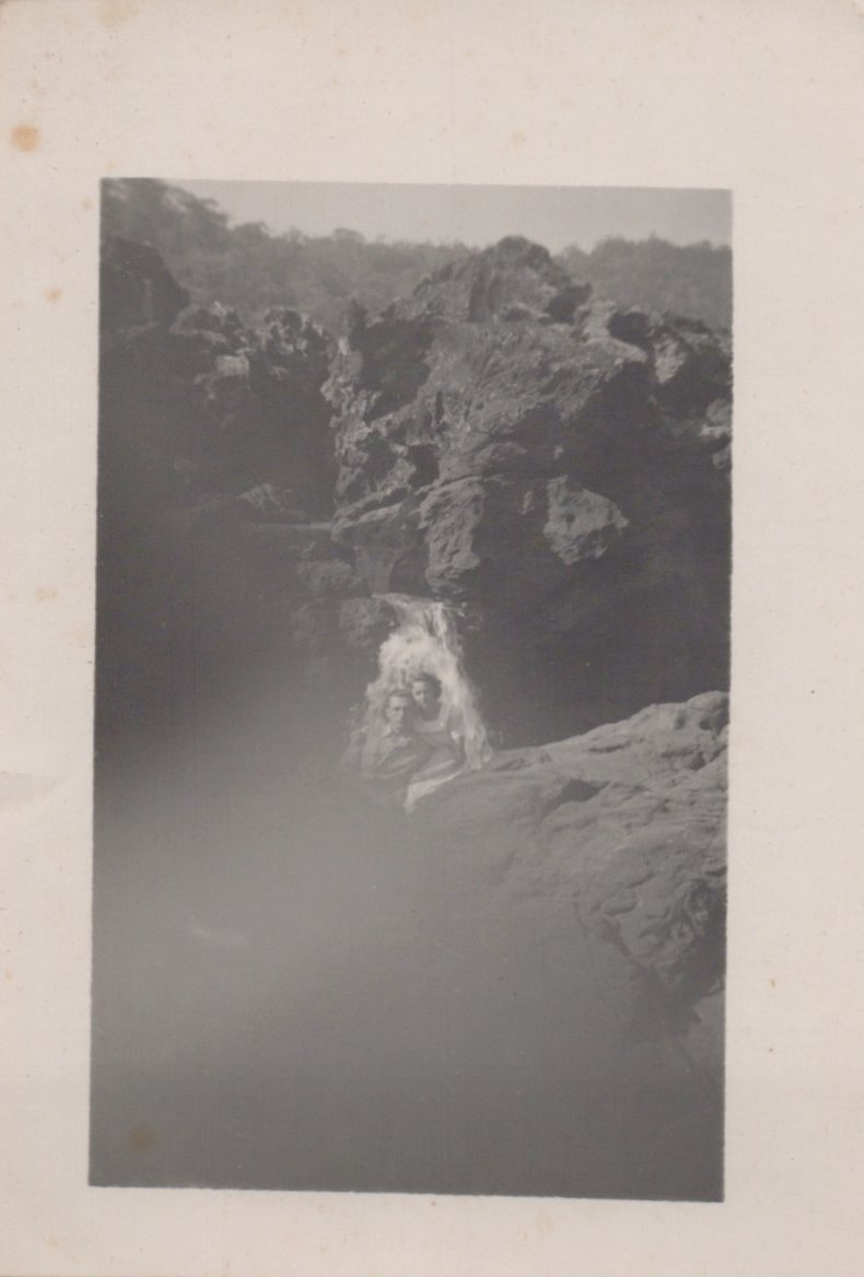 Retrato de casal não identificado; junto a uma queda d'água.