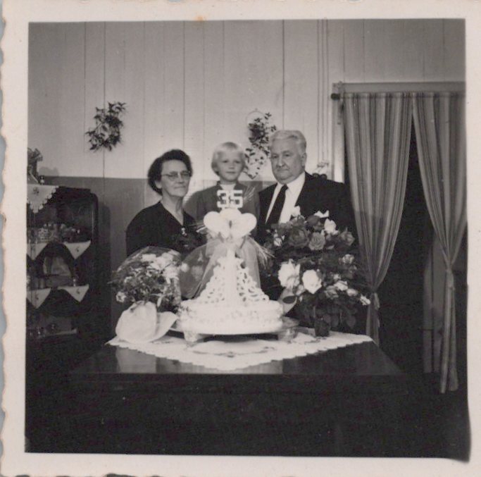 Retrato de Pedro e Ernestina Schneider em suas Bodas de Coral; 35 anos de casados; com a neta Vera Fiedler.