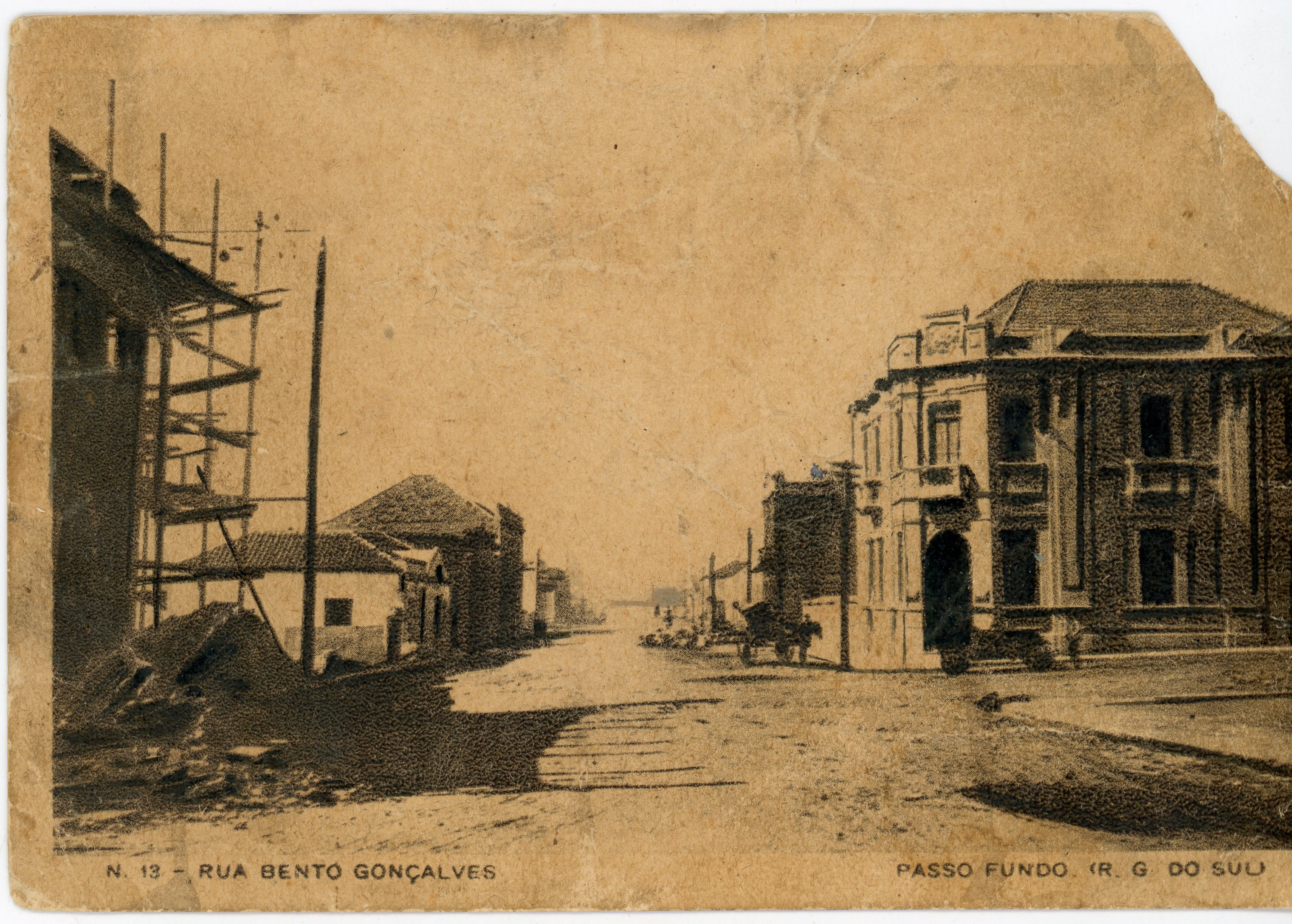Rua Bento Gonçalves esquina com a Rua Independência com vista do edifico do Banco Nacional, da Casa Mioto em construção