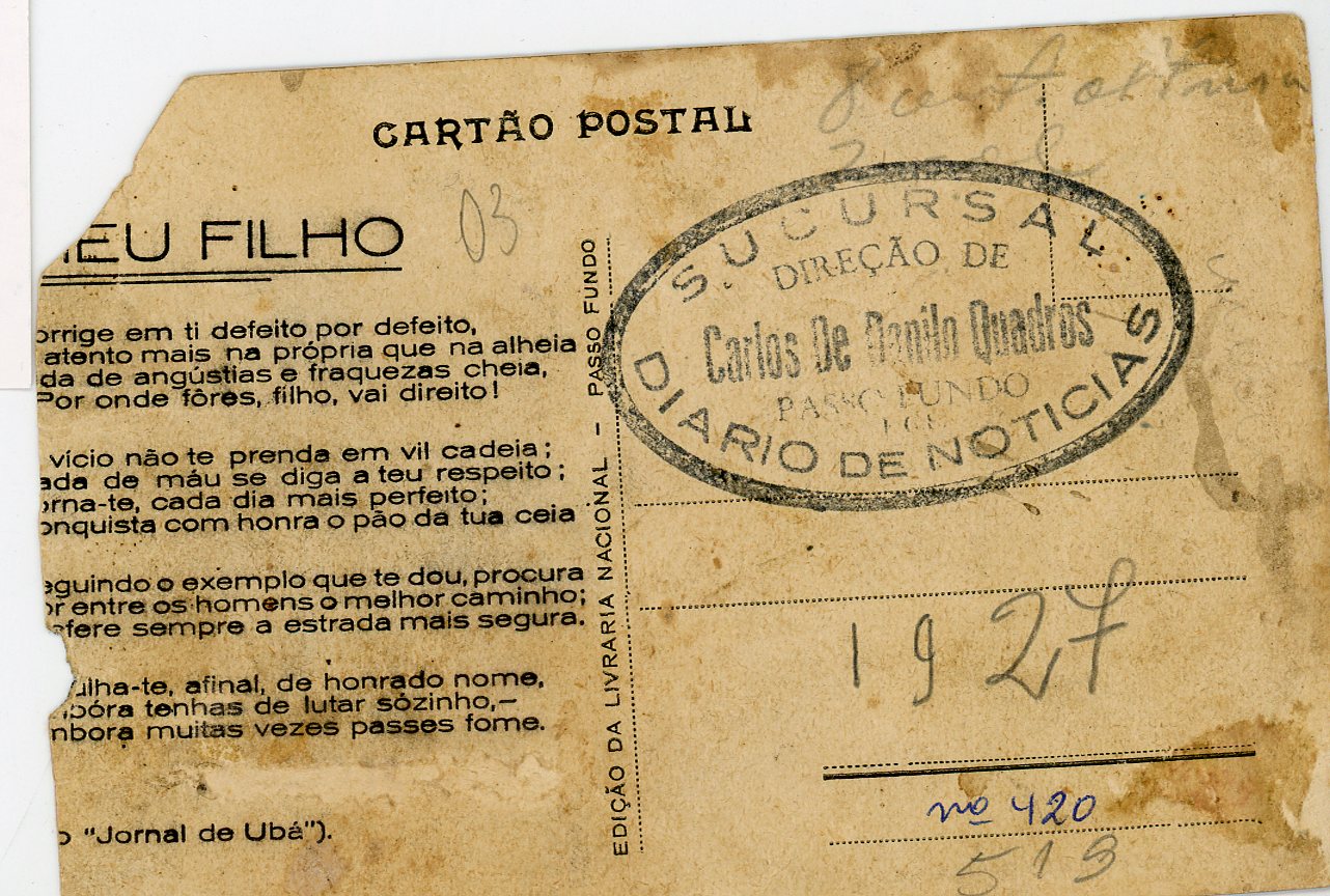 Acervo protegido pela Lei 9.610/98. Proibida a reprodução para fins comerciais sem a autorização dos detentores legais do direito. A reutilização destes conteúdos é livre e gratuita devendo ser mencionado o IHPF como fonte de referência, na seguinte forma: Acervo Instituto Histórico de Passo Fundo. Se o item pertencer a alguma coleção/fundo, o nome também deve ser citado.