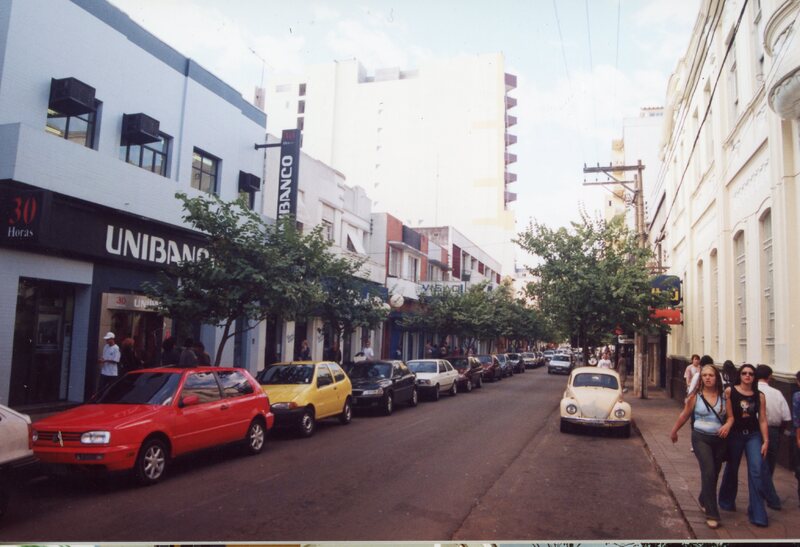 Vista da Rua Moron, vendo-se a direita o Unibanco e a esquerda o Banco Itaú.
