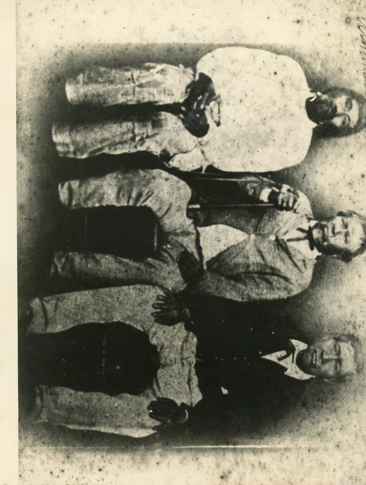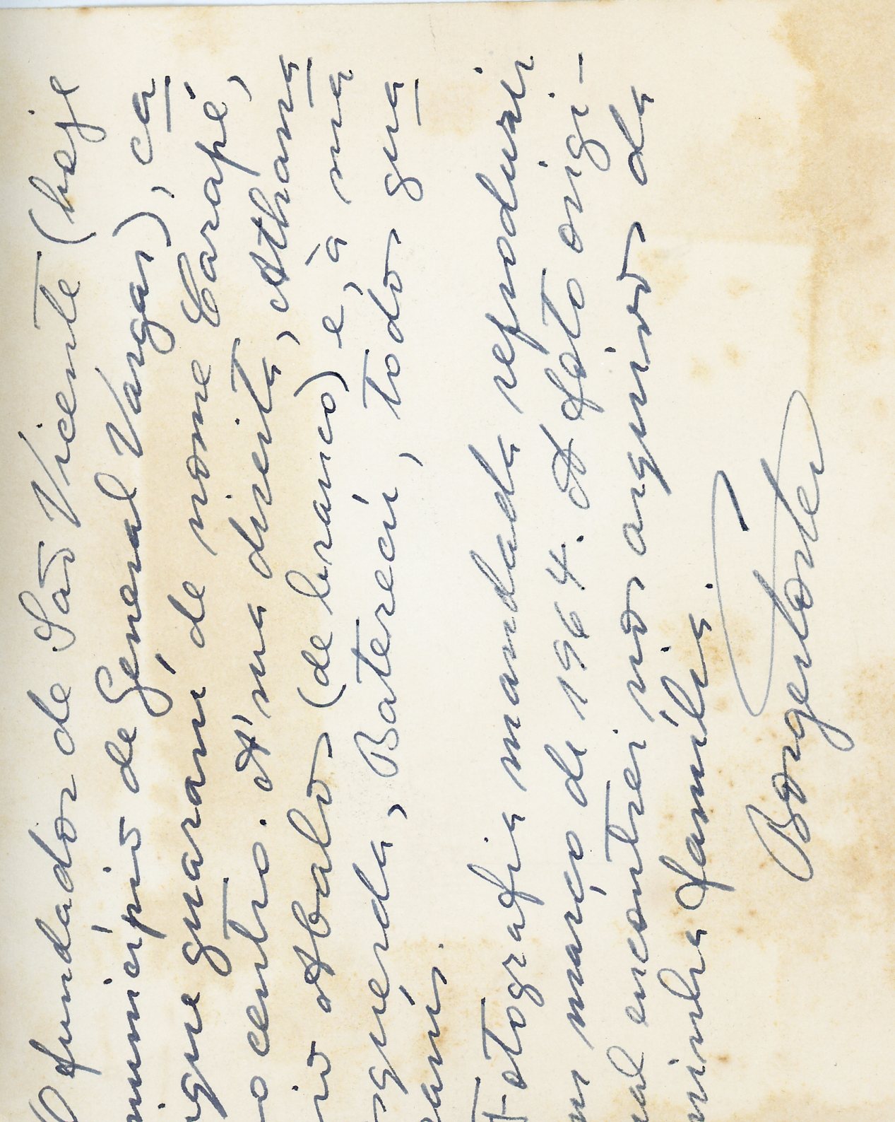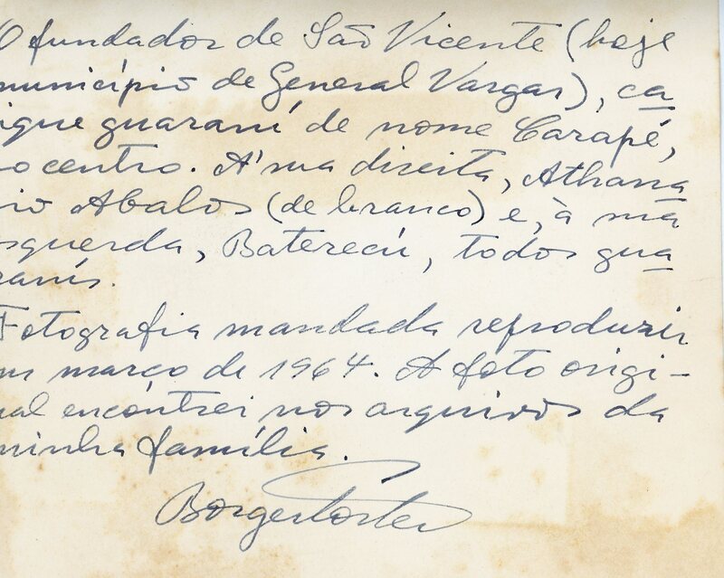 "Fundador de São Vicente, hoje Município de General Vargas, cacique Guarani de nome Carapé, ao centro. À sua direita Athanasio Abalos (de branco) e a sua esquerda Baterecú, todos Guaranis. Fotografia mandada reproduzir em março de 1964. A foto original encontrei nos arquivos de minha famÍlia."
