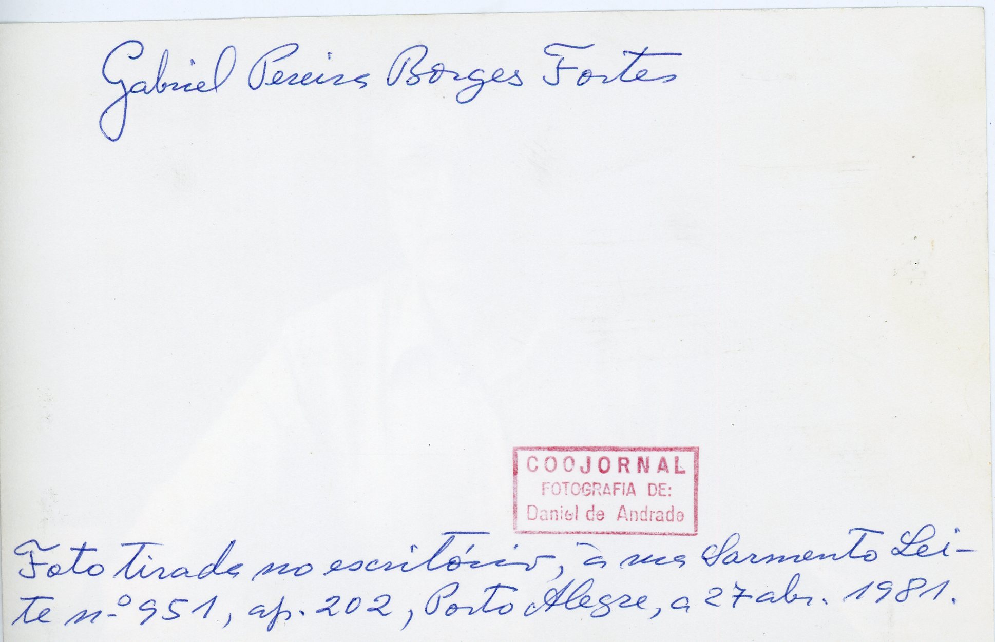 No verso observa-se um carimbo COOJORNAl Fotografia de Daniel de Andrade. Consta ainda a inscrição " Gabriel Pereira Borges Fortes