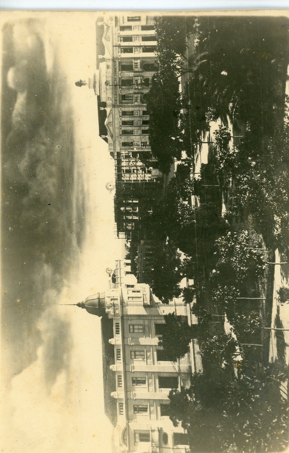 Vista da cidade, árvores e edifícios. Local não identificado.