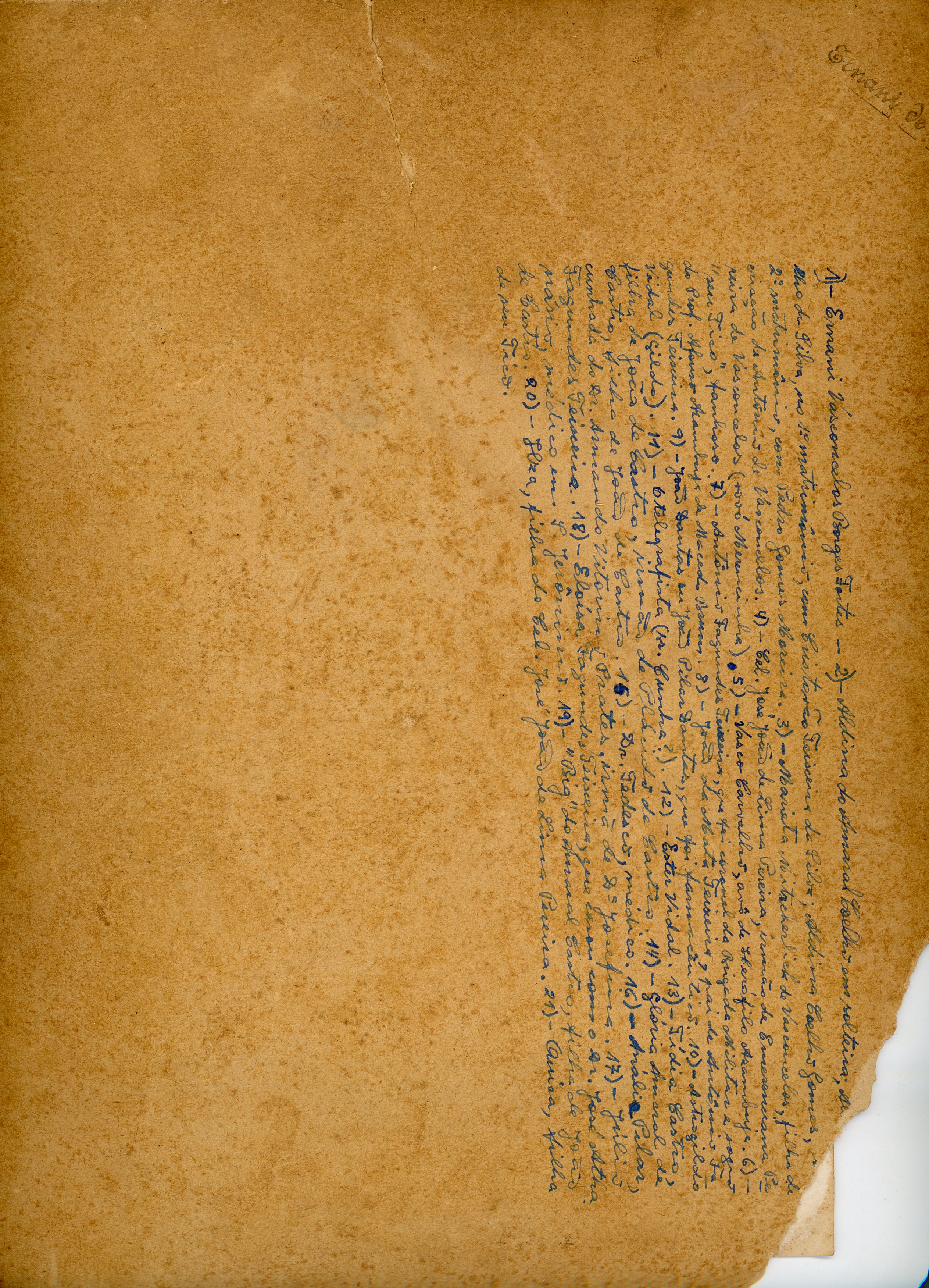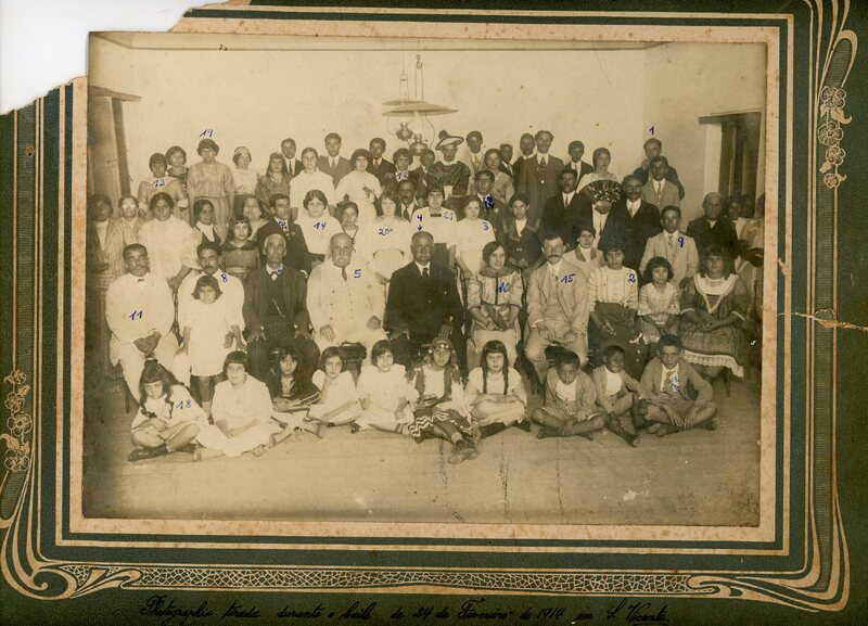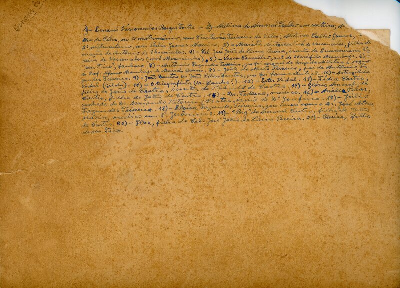 No verso consta a inscrição, 1)- Ernani Vasconcelos Borges Fortes - 2)- Aldina do Amaral Coelho em solteira; Aldina Coelho da Silva, no 1° matrimônio, com Cristóvão Teixeira da Silva, Aldina Coelho Gomes, no 2° matrimônio, com Pedro Gomes Moreira. 3)- Marieta Mitzcherlick de Vasconcelos, filha de criação de Antônio de Vasconcelos. 4)- Cel. José João de Lima Pereira, irmão de Emerenciana Pereira de Vasconcelos (vovó Merencinha). 5) - Vasco Carvalho, avô de Herófilo Azambuja. 6)- "seu Tico", fanhoso. 7)- Antônio Fagundes Teixeira, que foi coronel da Brigada militar e sogro do Prof. Afonso Azambuja de Macedo Brum. 8)- João da Mata Teixeira, pai de Antônio Fagundes Teixeira. 9)- João Dantas ou João Pilar Dantas, que foi farmacêutico. 10)- Astrogildo Vidal (Gildo). 11)- O telegrafista (Sr. Cunha?). 12)- Ester Vidal. 13)- Tídia Castro, filha de João Castro, irmã de Plácido de Castro. 14)- Glória Amaral de Castro, filha de João de Castro. 15)- Dr. Tedesco, médico. 16)- Anália Pilar, cunhada do Dr. Armando Vitorino Prates, irmã de Dona Josefina. 17)- Júlio Fagundes Teixeira. 18)- Eloísa Fagundes Teixeira, que casou com o Dr. José Athanásio, médico em São Jerônimo. 19)- "Big" do Amaral Castro, filha de João de Castro. 20)- Ilza, filha do Cel. José João de Lima Pereira. 21)- Quica, filha de seu Tico.