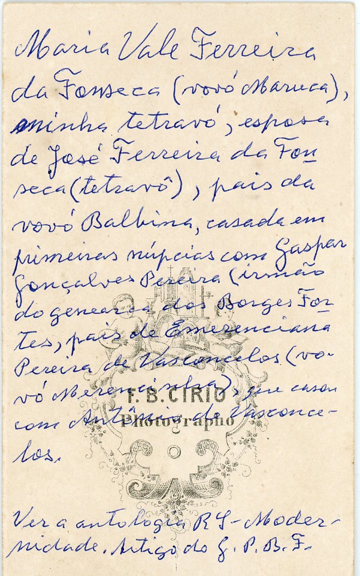 No verso consta a inscrição, "Maria Vale Ferreira da Fonseca( Vovó Maruca), minha tetravó, esposa de José Ferreira da Fonseca (tetravó), pais da vovó Balbina, casada em primeiras núpcias com Gaspar Gonçalves Pereira( irmão do General dos Borges Fortes, pais de Emerenciana Pereira de Vasconcelos (vovó Merencinha), que casou com Antônia de Vasconcelos.