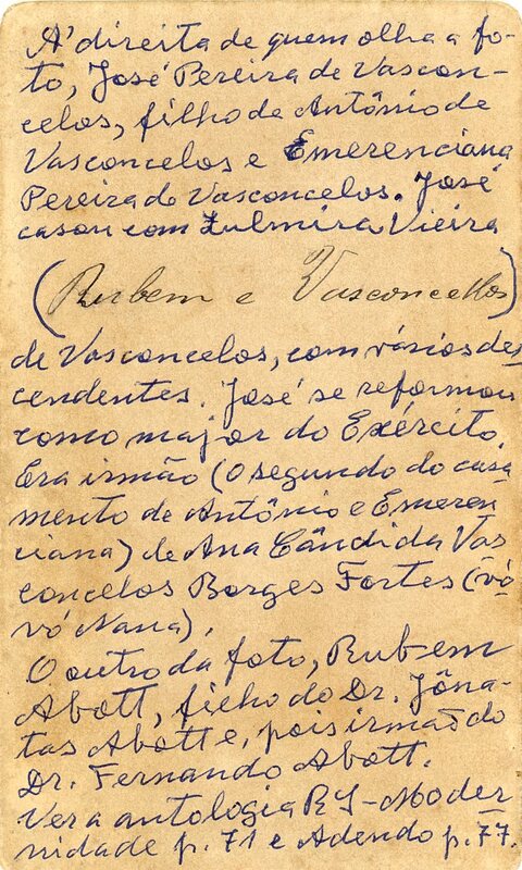 No verso consta a inscrição, "A' direita de quem olha a foto, José Pereira de Vasconcelos, filho de Antônio de Vasconcelos e Emerenciana Pereira de Vasconcelos. José casou com Zulmira Vieira