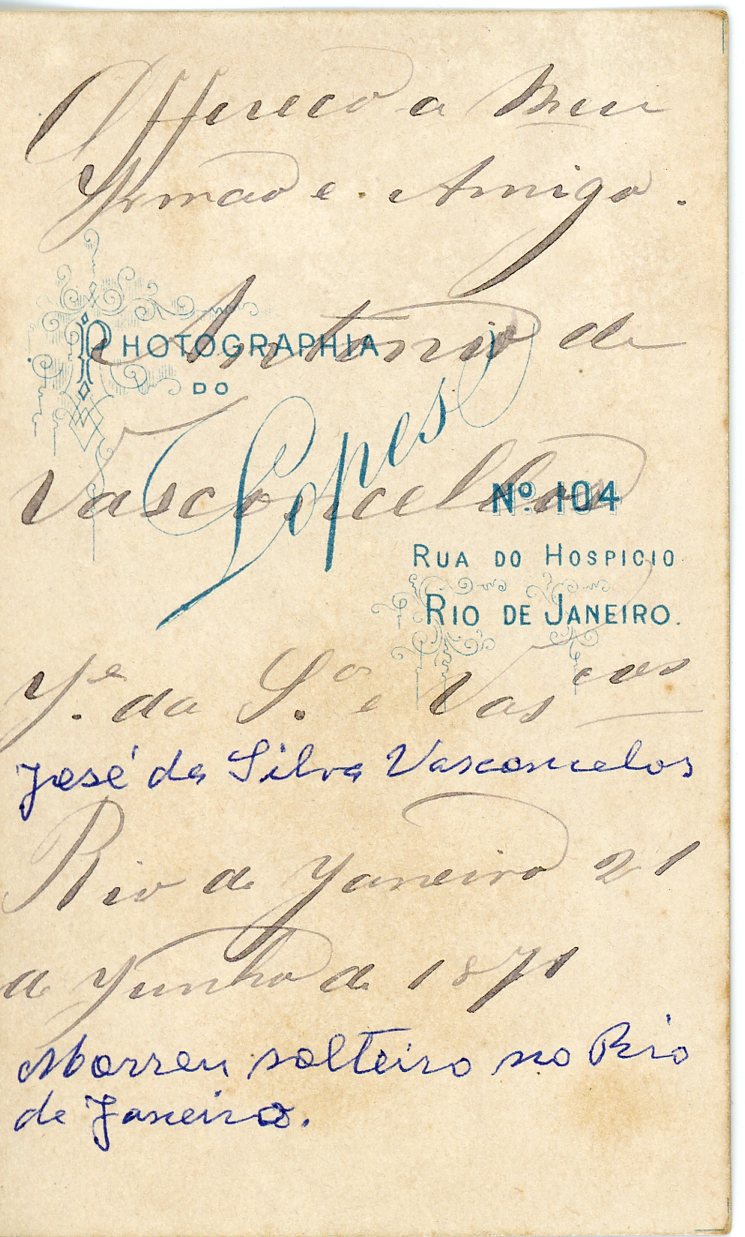 No verso consta a inscrição, "Offerecido a meu irmão e amigo Antônio de Vasconcellos, José da Silva Vasconcelos