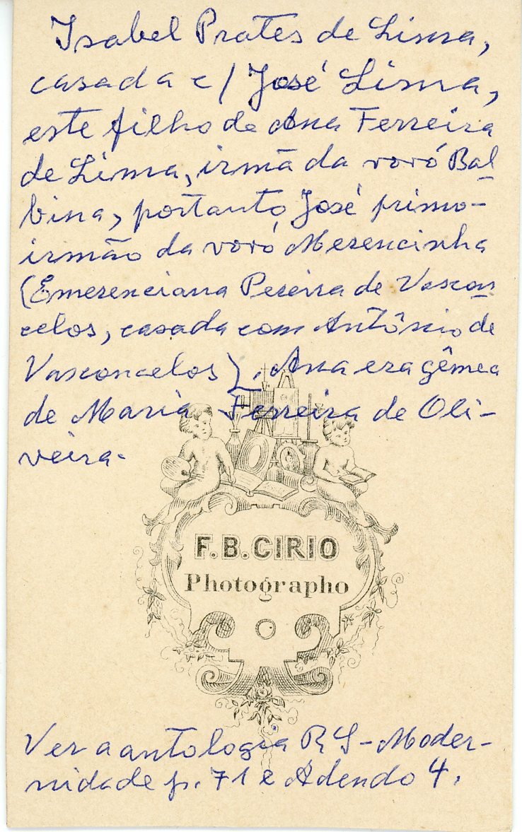 No verso consta a inscrição, "Isabel Prates de Lima, casada c/ José Lima, este filho de Ana Ferreira de Lima, irmã da Vovó Balbina, portando José primo - irmão da Vovó Merencinha ( Emerenciana Pereira de Vasconcelos, casada com Antônio de Vasconcelos), Ana era gêmea de Maria Ferreira de Oliveira.