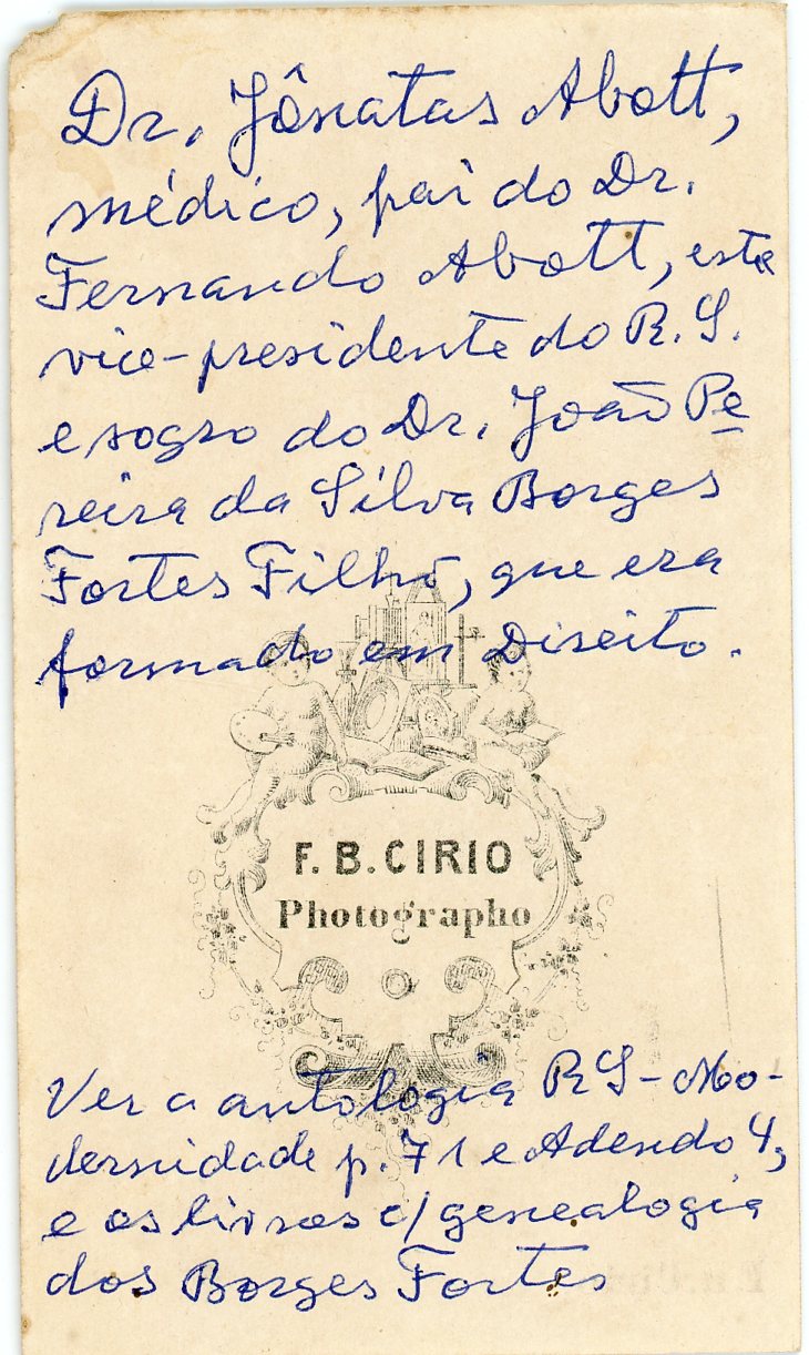 No verso consta a inscrição, "Dr. Jônatas Abott, médico pai do Dr. Fernando Abott, este vice - presidente do R.S. e sogro do Dr. João Pereira da Silva Borges Fortes Filho, que era formado em Direito.