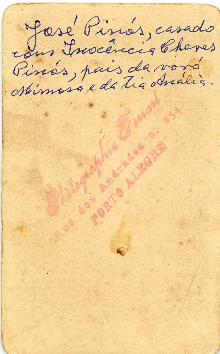 No verso consta a inscrição, "José Pinos, casado com Inocência Chaves Pinós, pais da vovó Mimosa e da Tia Anália."