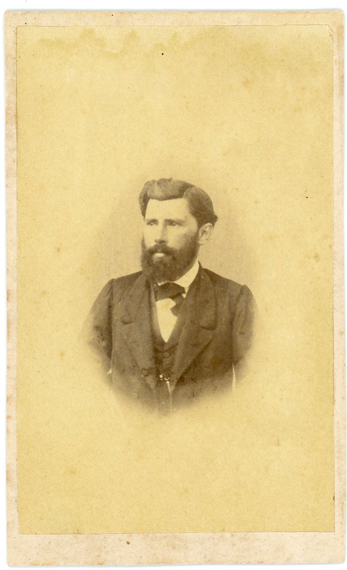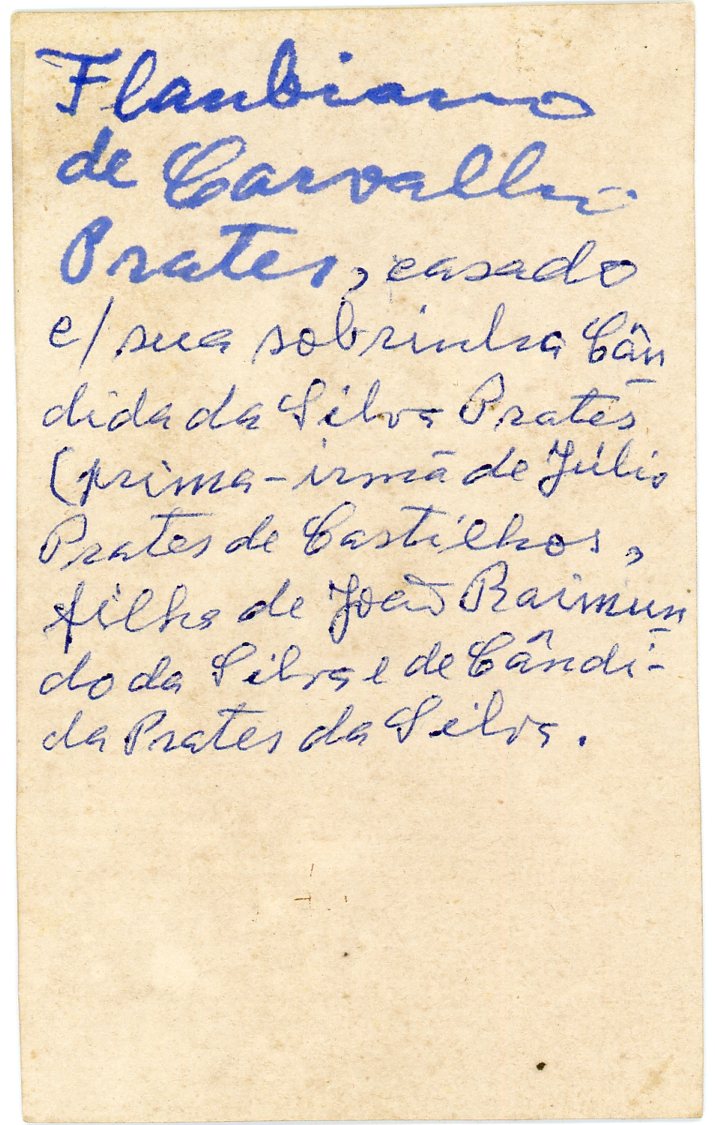 No verso consta a inscrição, "Flaubiano de Carvalho Prates, casado c/ sua sobrinha Cândida da Silva Prates (prima - irmã de Júlio Prates de Castilhos filho de João Raimundo da Silva e de Cândida Prates da Silva."