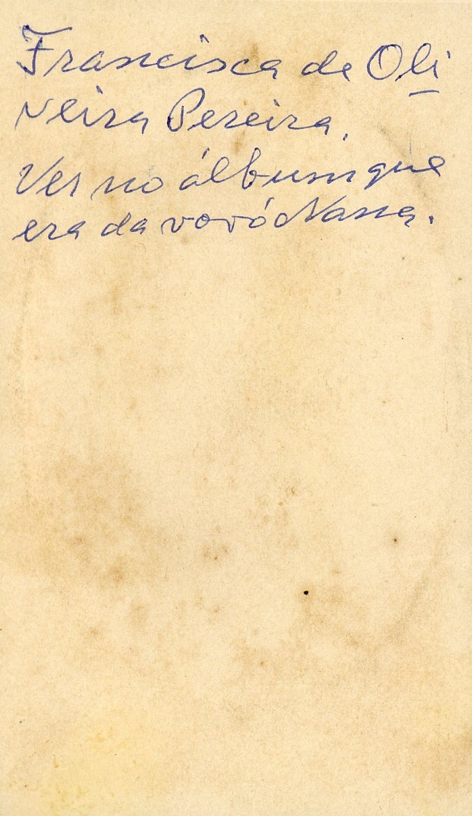 No verso consta a inscrição, "Francisca de Oliveira Pereira. Ver no álbum que era da vovó Nana."